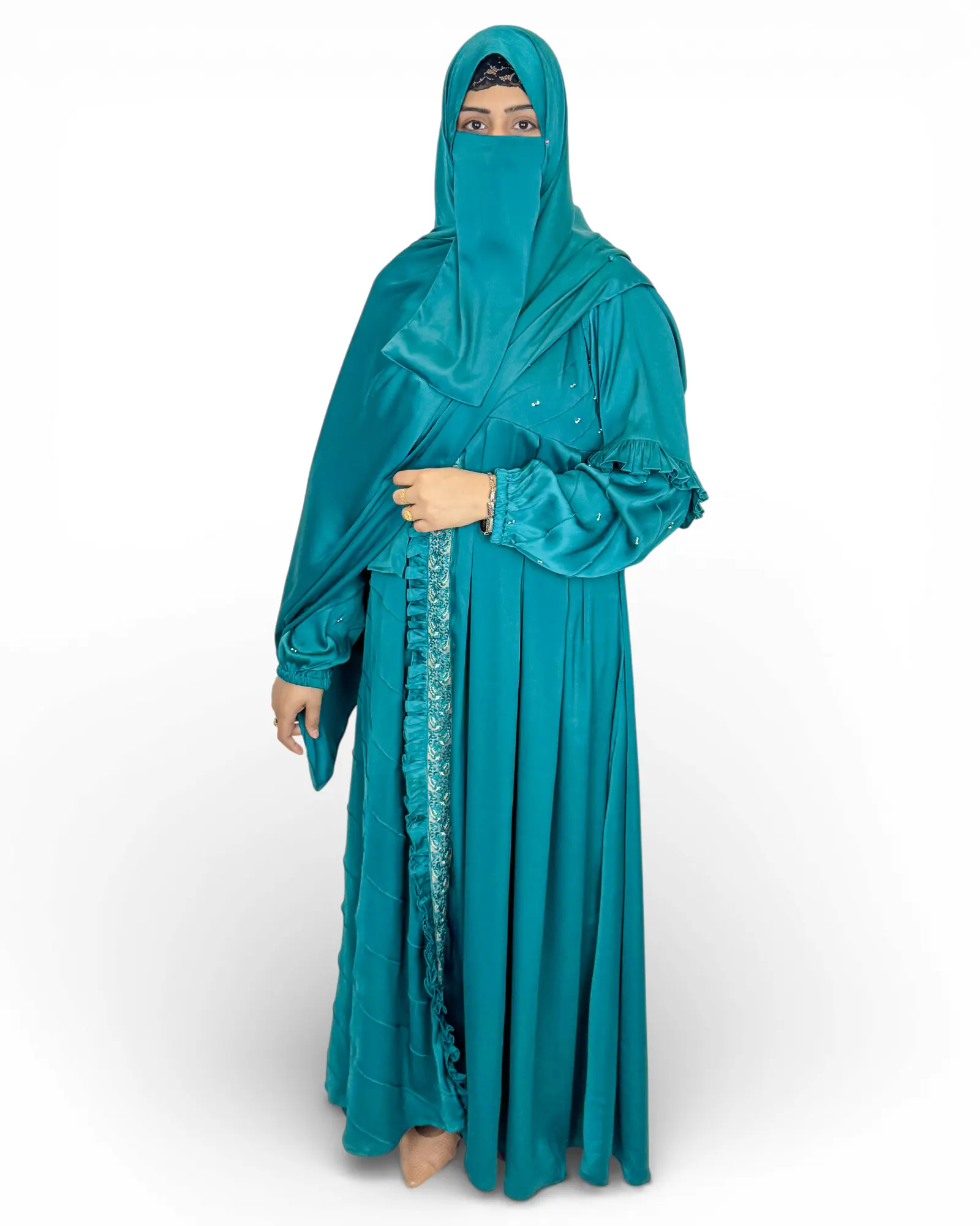 Note on Color: We strive to capture our articles as accurately as possible. However, due to professional lighting and variations in digital screen settings, the actual teal hue of the imported fabric may vary slightly from what you see on your screen.