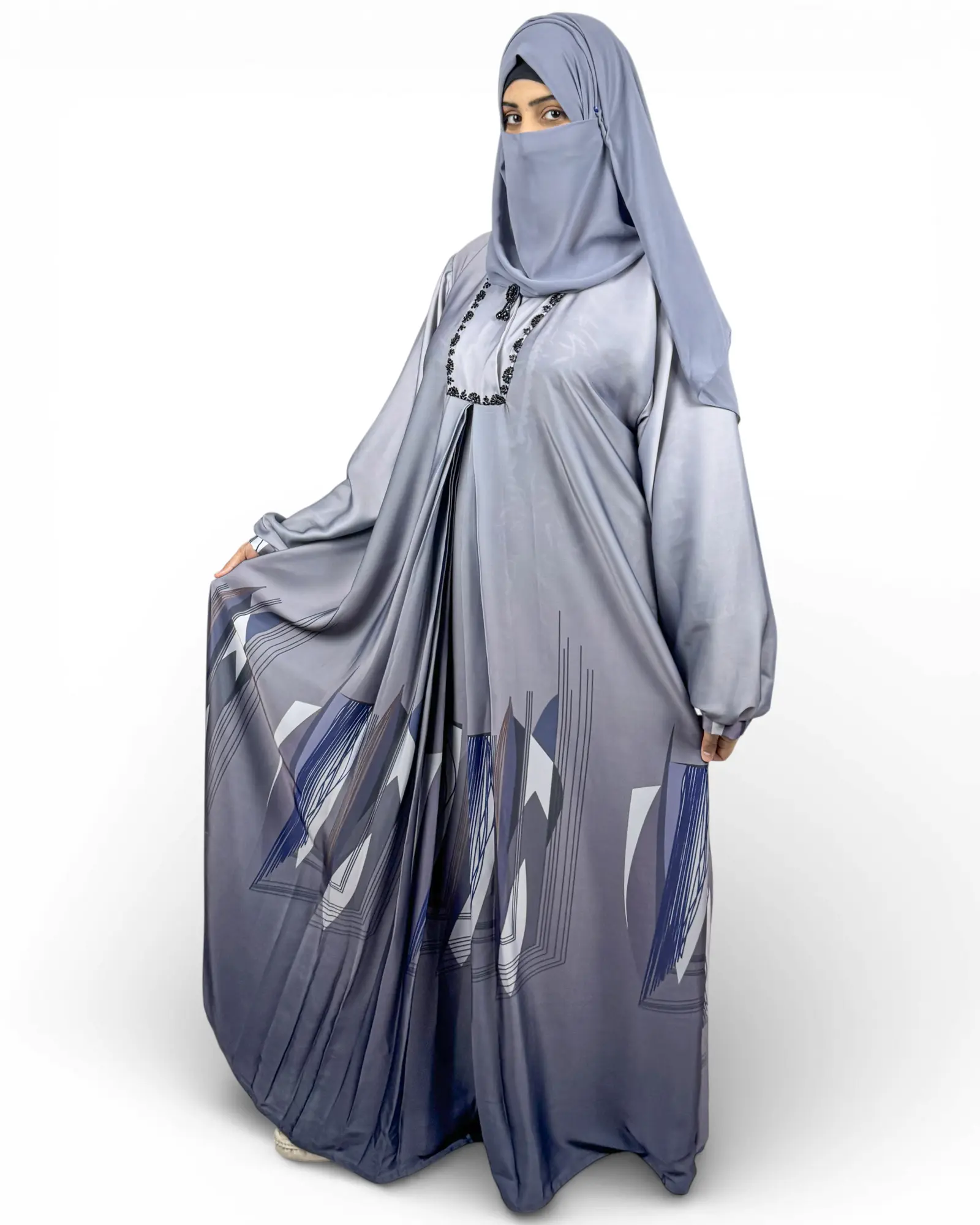 The Skyline is designed for the woman who seeks a sharp, contemporary look without compromising on modesty. Unlike standard market abayas that use thin local materials, the Skyline is constructed from a premium imported fabric specifically chosen for its unique cool-toned hue and its ability to hold a crisp, professional silhouette.